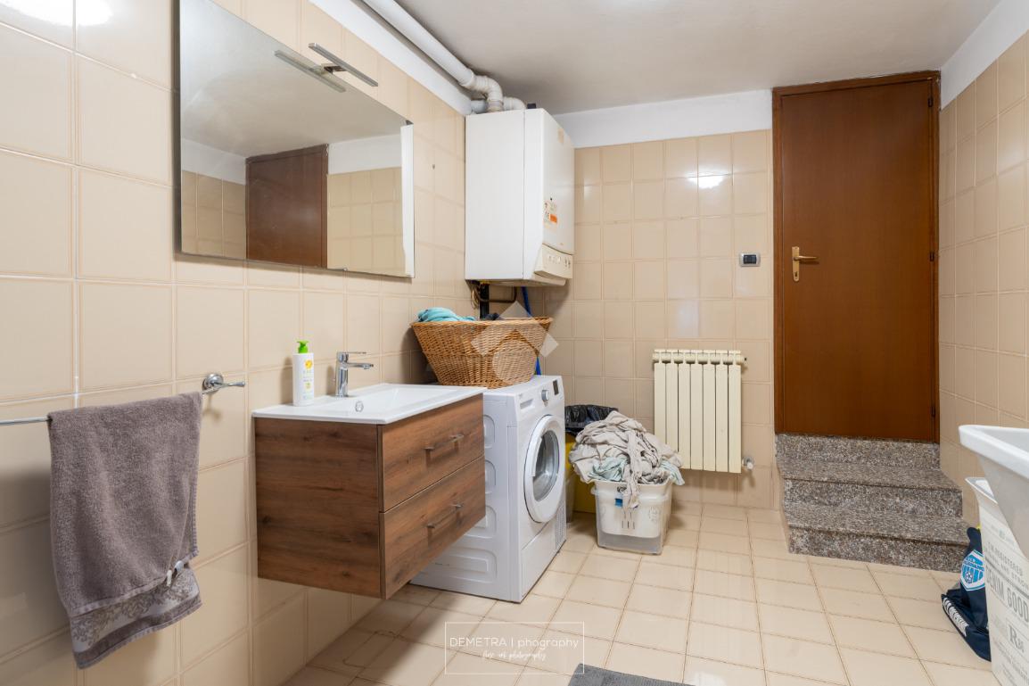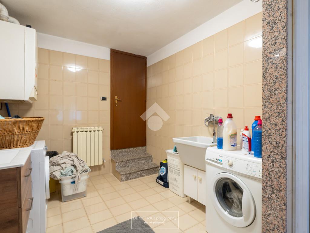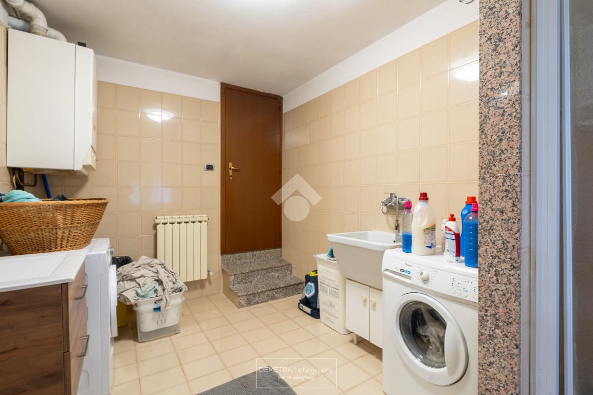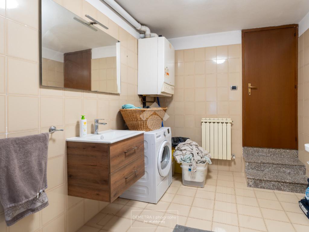 Internamente, gli spazi sono così sviluppati: a piano terra vi è l'ingresso indipendente, una autorimessa di 32 mq, un bagno lavanderia di ampie dimensioni con doccia e sanitari, un ripostiglio e l'accesso all'area cortiliva di proprietà, piantumata e recintata.