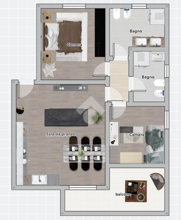 L'ingresso si apre su un luminoso soggiorno con angolo cottura, ideale per chi ama gli spazi aperti e conviviali. La zona notte comprende due camere da letto, una matrimoniale e una singola, perfette per una famiglia o per chi desidera uno spazio aggiuntivo per ospiti o studio.