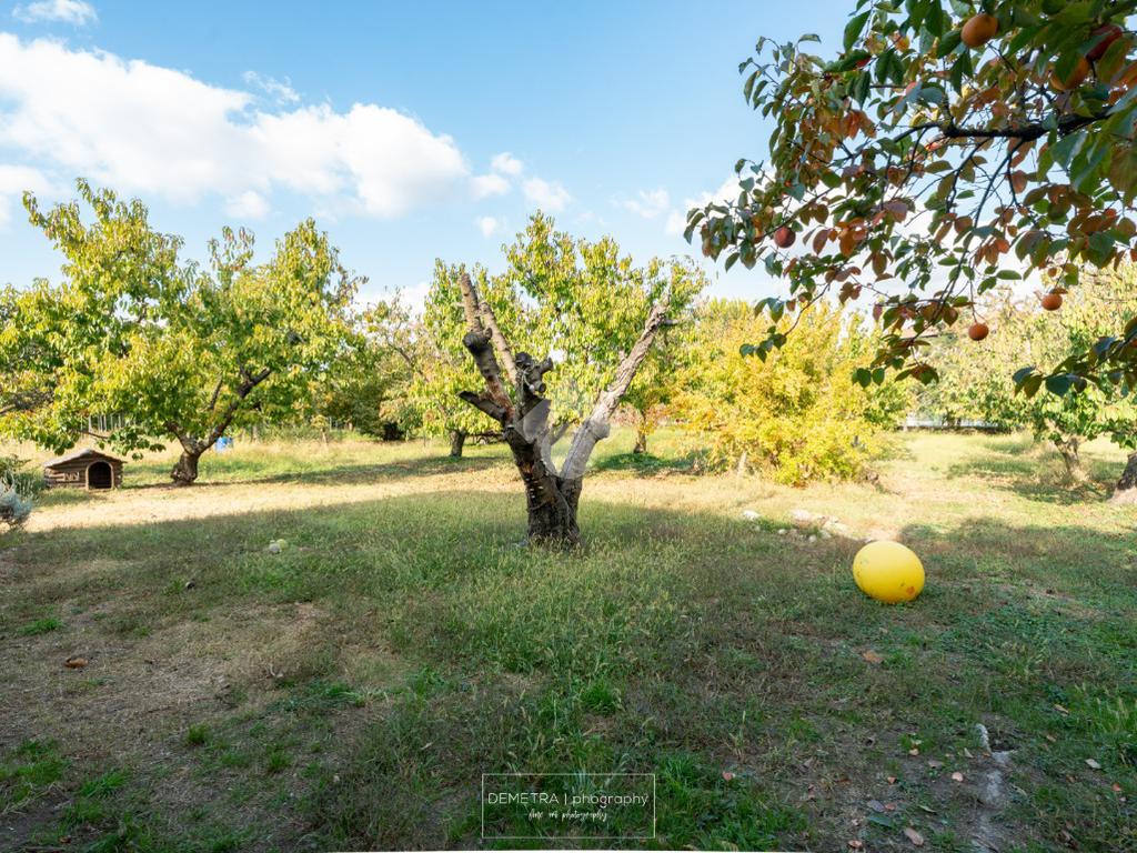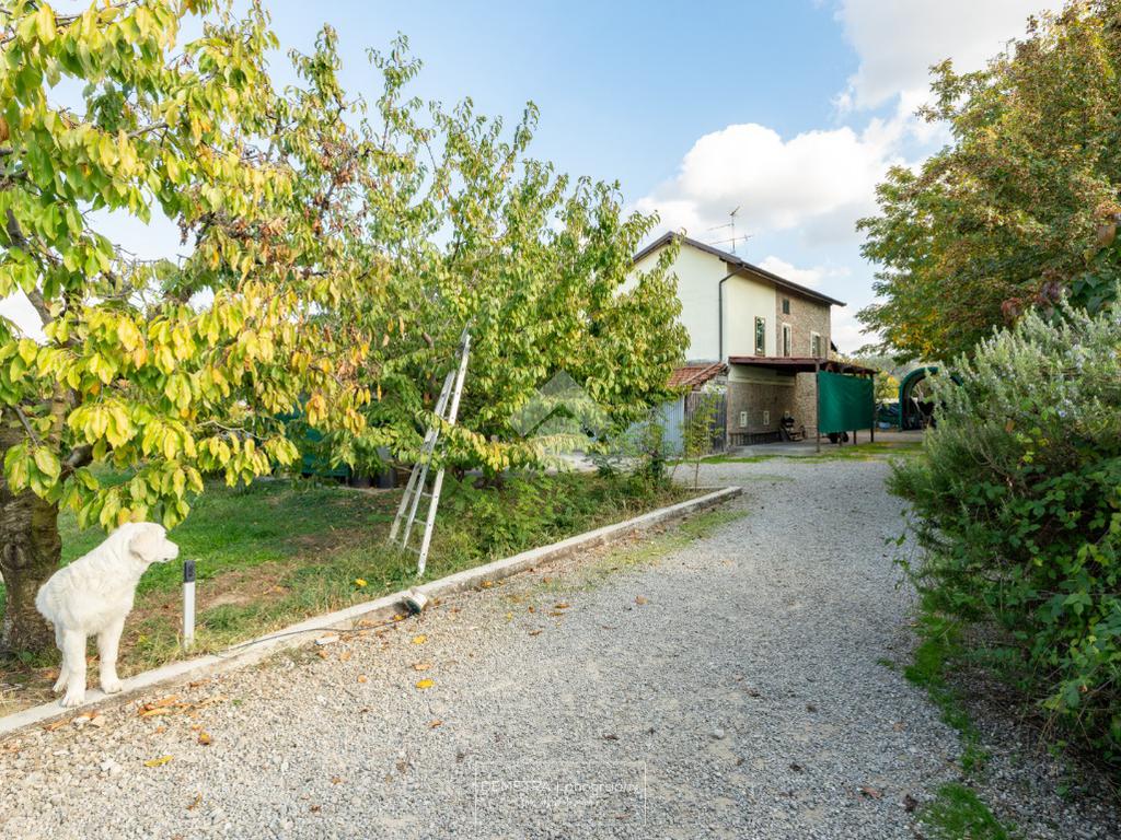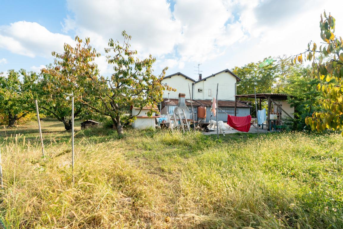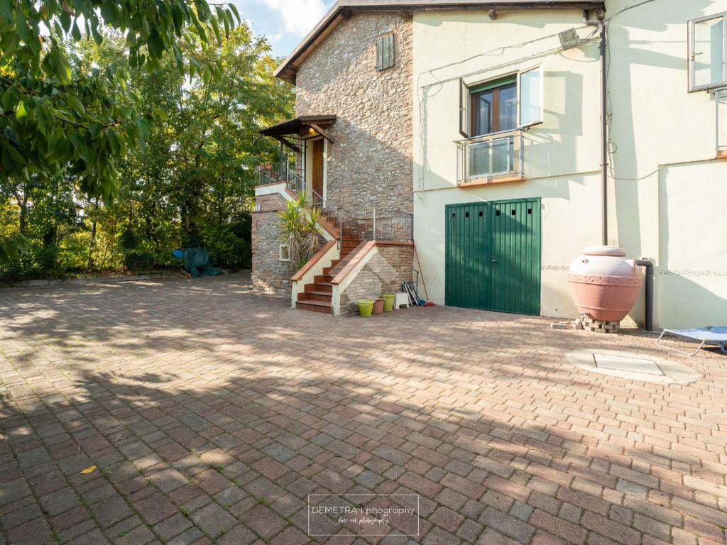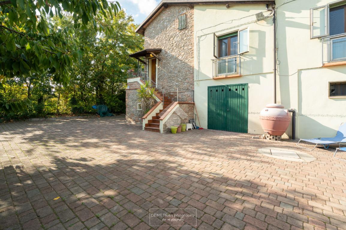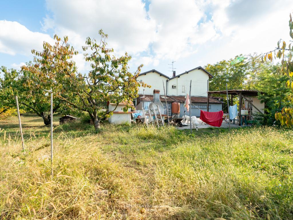 Il fabbricato esternamente si presenta parzialmente tinteggiato ed intonacato di giallo ed in parte in pietra a vista. Tutto attorno vi è l'area cortiliva, parzialmente inghiaiata e parzialmente pavimentata e circa 6000 mq di terreno piantumato a ciliege.